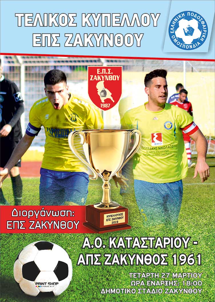 Tην Τετάρτη το απόγευμα στο Δημοτικό στάδιο του νησιού θα πραγματοποιηθεί ο 32ος τελικός Κυπέλλου της ΕΠΣ Ζακύνθου μεταξύ του ΑΟ Κατασταρίου και του ΑΠΣ Ζάκυνθος 1961 στις 18.00. Oι τυπικά γηπεδούχοι για να βάλουν το “κερασάκι στην τούρτα” της εκπληκτικής φετινής χρονιάς στην Γ΄ Εθνική και οι τυπικά φιλοξενούμενοι για να βάλουν “βάλσαμο” στις φετινές “πληγές” της ομάδας με την απώλεια του πρωταθλήματος. Διαιτητής του αγώνα θα είναι ο Αντώνης Μποζίκης με βοηθούς τους Τρομπούκη και Μπάστα, 4ος θα είναι ο Δημ. Κωστάκης. Γηπεδούχος ομάδα μετά από κλήρωση βγήκε ο ΑΟΚ. Η είσοδος θα είναι στα 5 ευρώ.Παρατηρητής αγώνα θα είναι ο Νίκος Καλλιβωκάς. Οι ομάδες θα κάνουν από 3 βραβεύσεις η κάθε μία. Από τον ΑΟΚ θα βραβευτεί το Λύκειο Κατασταρίου, ο Παναγιώτης Τρουπιώτης και ο Πέτρος Καρυδάκης. Από τον ΑΠΣ θα βραβευτούν ο Νίκος Κοντονής, ο Τάκης Παπαδάτος και ο Διονύσης Μουζάκης (Μποζόνος). Θα τηρηθούν όλα τα μέτρα ασφαλείας δηλώνει η διοργανώτρια καθώς εντός γηπέδου θα μπουν μόνο όσοι έχουν διαπίστευση.