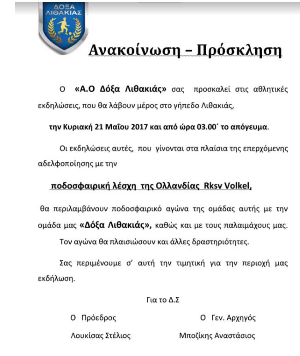 Αθλητικές εκδηλώσεις θα πραγματοποιηθούν την ερχόμενη Κυριακή 21/5 στο Γήπεδο της Λιθακιάς στο πλαίσιο της αδελφοποίησης του σωματείου της Δόξας με την Ολλανδική Λέσχη Rksv Volkel. Οι αγώνες θα ξεκινήσουν από τις 3 το μεσημέρι ενώ θα διεξαχθεί συνάντηση ανάμεσα στους παλαίμαχους των δύο συλλόγων. Οι εκδηλώσεις αυτές θα συνεχιστούν και την ίδια ημέρα το απόγευμα καθώς μετά την λήξη των ποδοσφαιρικών αναμετρήσεων θα υπάρξει και δείπνο προς τιμήν των Ολλανδών προσκεκλημένων . Το RKSV Volkel είναι ένα ερασιτεχνικό αθλητικό σωματείο υπό από την Nederlandse dorp Volkel (επαρχία Noord-Brabant).