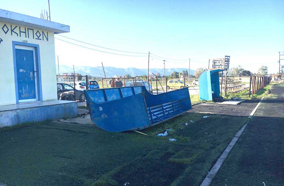 Πραγματικά μόνο ντροπή μπορεί να αισθανθεί κάποιος από αυτά που συμβαίνουν. Στο γήπεδο των Αμπελοκήπων δεν υπάρχει νερό, οι τουαλέτες σε άθλια κατάσταση όσο για το νερό είδος προς εξαφάνιση! (φωτο) Στο Μαχαιράδο (φωτο) έχει πέσει η σκεπή στα αποδυτήρια των φιλοξενούμενων και από εκεί από μια τρύπα βλέπει τον ουρανό! Τα ίδια στα γήπεδα του Αγγερικού και της Λιθακιάς! Στο γηπεδο των Αμπελοκήπων είναι το πιο μεγάλο πρόβλημα…  Μάλιστα πριν μερικές ημέρες οι ισχυροί άνεμοι έριξαν τον πάγκο (φωτο)