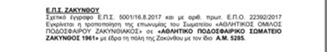 Μια μεγάλη ημέρα είναι η σημερινή για την ομάδα της Ζακύνθου καθώς το διοικητικό συμβούλιο της Ελληνικής Ποδοσφαιρικής Ομοσπονδίας επικύρωσε το ιστορικό όνομα του σωματείου! Σύμφωνα με έγκυρες δημοσιογραφικές πληροφορίες της αθλητικής ραδιοφωνικής εκπομπής της Ζακύνθου “Ελ κλάσικο”  το όνομα της ομάδας θα είναι “ΑΠΣ Ζάκυνθος 1961” (Αθλητικό Ποδοσφαιρικό Σωματείο Ζάκυνθος 1961), κάτι που επιβεβαιώνεται και από το επίσημο έγγραφο το οποίο λίγο μετά το μεσημέρι της Πέμπτης 28 Σεπτεμβρίου 2017 στα γραφεία της τοπικής ένωσης (βλέπε φώτο).