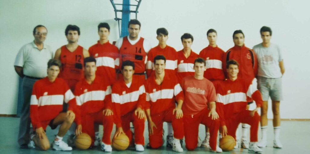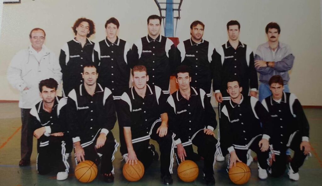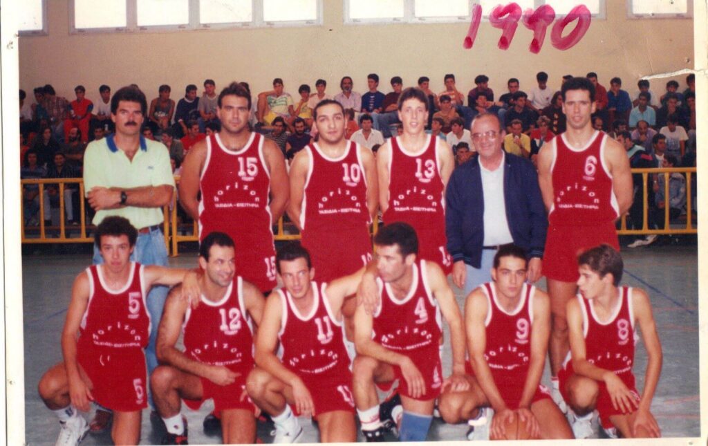Φωτογραφία της αντρικής ομάδας μπάσκετ τραβηγμένη στο (κατεδαφισμένο πλέον) κλειστό του Δημοτικού Σταδίου το 1990 πριν από αγώνα.