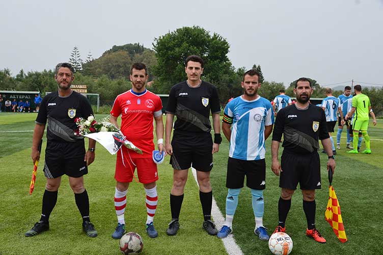 *Οι αρχηγοί Γεωργίου και Τσιώλης με τους διαιτητές Καλογεράκο, Μποζίκη και Κόκλα