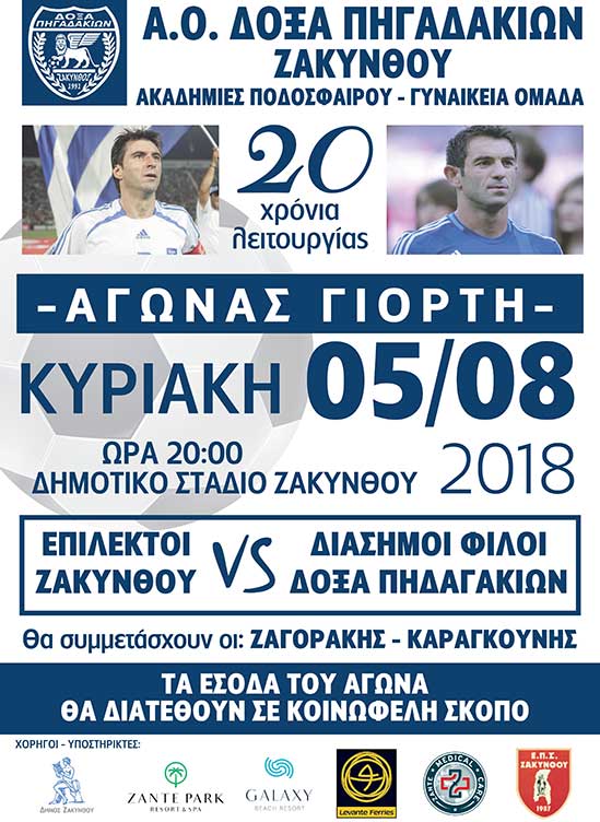 Στις 20.00 θα γίνει ο μεγάλος ποδοσφαιρικός αγώνας μεταξύ επίλεκτης ομάδας από το νησί και της ομάδας των διάσημων. Σε αυτή την ομάδα θα αγωνιστούν οι Ζαγοράκης, Καραγκούνης, Φύσσας, Παχατουρίδης, Γκόγκιτς, Βαμβακούλας, Μπέλος, Λουλές και Κάραμα. Σε αυτό το σημείο αξίζει να αναφέρουμε ότι θα γίνουν και βραβεύσεις στα πρόσωπα που θα τιμήσουν την Δόξα Πηγαδακίων.