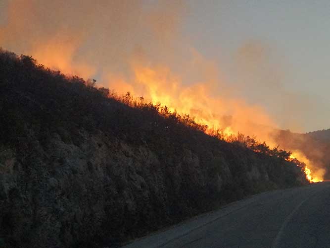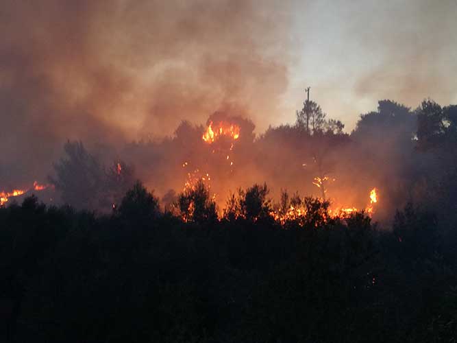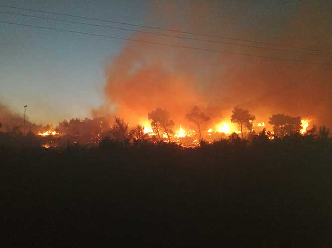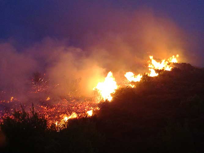 Μάχη με την πύρινη λαίλαπα δίνουν μέσα στη νύχτα οι πυροσβέστες και ιδιώτες στα σύνορα μεταξύ του Αγαλά και της Λιθακιάς. Συγκεκριμένα στον νταμάρι του Κούλα, εκεί που η φωτιά πέρασε τον δρόμο και κατευθύνεται νοτιοανατολικά προς την Λιθακιά. Οι δυνατοί άνεμοι στροβιλίζουν την φωτιά που γίνεται απρόβλεπτη αλλάζοντας συνέχεια κατευθύνσεις.