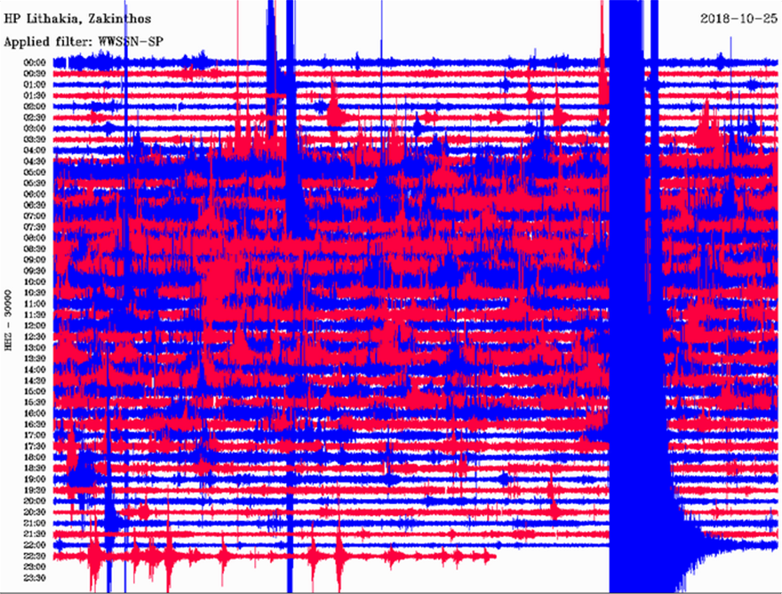 Δείτε το σεισμό, όπως τον κατέγραψε ο σεισμογράφος του Σεισμολογικού Δικτύου του Εργαστήριο Σεισμολογίας του Πανεπιστημίου Πατρών, που είναι τοποθετημένος στη Λιθακιά Ζακύνθου.